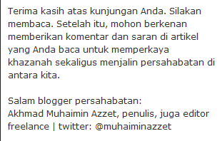 Masih ada beberapa tulisan lain yang dipaparkan oleh Pak Azzet dengan gamblang tetapi ringan. Kemampuan beliau menyampaikan ide membuat para pembaca antusias, terlihat dari banyaknya komentar yang masuk. Diskusi santai pun tak urung terjalin pada postingan yang beliau tulis. Tidak keliru rasanya jika saya merekomendasikan amazzet.com kepada Sahabat sekalian. Silakan berkunjung, menikmati, lalu memetik mutiara inspirasinya sebagai buah tangan berharga. Happy blogwalking, Pals!
